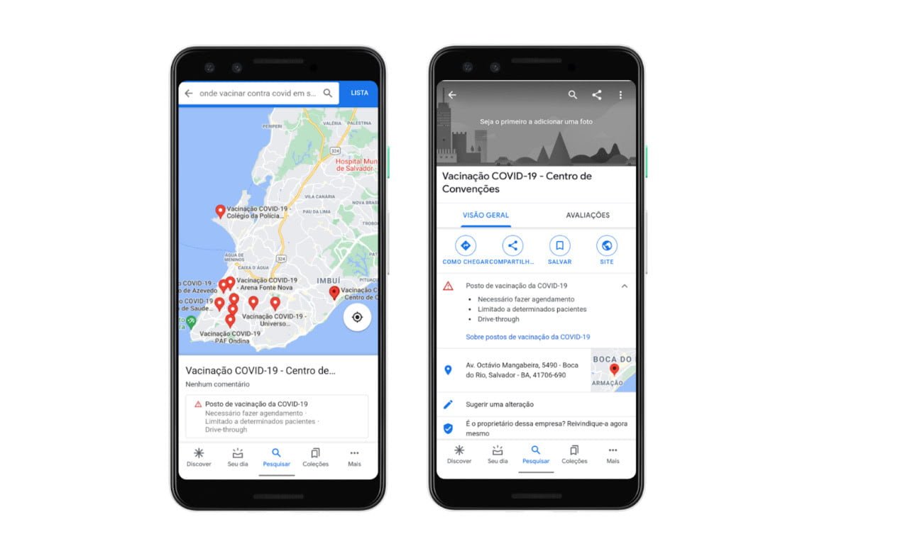 Desde abril, é possível consultar diretamente no Google Maps e na Busca do Google locais de vacinação contra o coronavírus e encontrar aqueles mais próximos de você nas capitais brasileiras. A partir de hoje, a funcionalidade estará disponível em mais 36 cidades espalhadas pelo país (veja abaixo a lista completa). O objetivo do Google é adicionar mais localidades em breve.