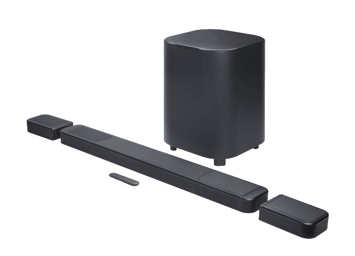 Entre os destaques dessa soundbar, a JBL incluiu processadores Dolby Atmos e DTS:X, que podem ser ativados pelo app JBL One ou pelos assistentes de voz Google ou Siri. Traz ainda o MultiBeam, patente da marca, criado para expandir a reprodução no ambiente, agora em sua versão 3.0.