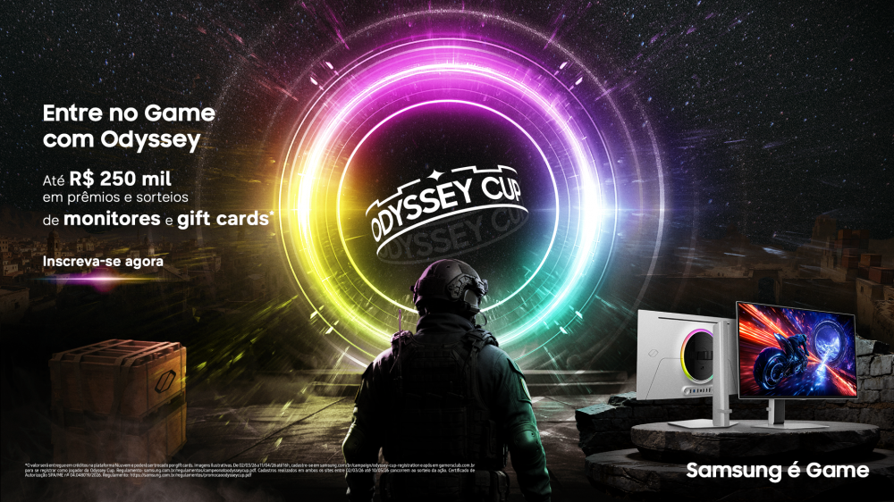 A Samsung Brasil destaca que ainda dá tempo de se inscrever na Odyssey Cup 2026, campeonato nacional de Counter-Strike 2 que reúne jogadores amadores e profissionais de todo o país. Esta é uma oportunidade concreta para jogadores entrarem na disputa e, potencialmente, enfrentarem grandes equipes do cenário competitivo a partir da Fase Suíça, com início em 24 de abril.