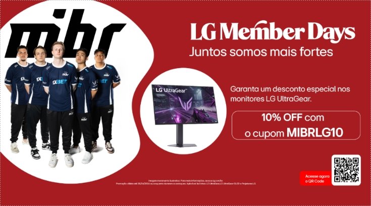 A LG Electronics (LG) anuncia sua ação especial de Members Day, uma campanha que abrange todas as unidades de negócio da marca e oferece condições exclusivas em produtos premium para seus consumidores. Na categoria gamer, além das ofertas promocionais da campanha, a marca firmou parceria com a MIBR — organização brasileira de e-sports — e disponibiliza um cupom adicional de 10% de desconto para as linhas UltraGear e UltraGear OLED, reconhecidas por sua alta performance e tecnologia de ponta. O cupom promocional é válido até o dia 30 de abril.