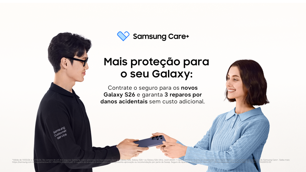 A iniciativa reforça o compromisso da Samsung em oferecer uma experiência completa e segura para quem investe nos dispositivos mais avançados da marca, como o Galaxy S26, Galaxy S26+ e Galaxy S26 Ultra.