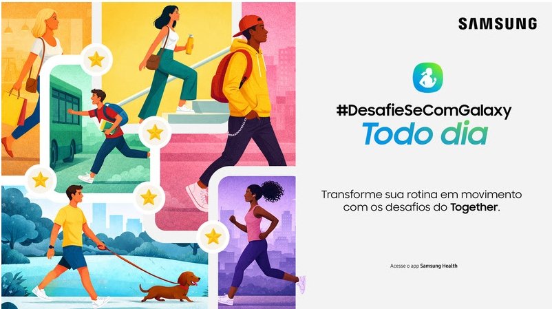 Com início em 1º de abril e duração até 14 de junho de 2026, o #DesafieSeComGalaxy convida as pessoas a atingirem a meta de 500.000 passos no período. O desafio está disponível na aba Together do app Samsung Health e incentiva a criação de um hábito saudável de forma consistente e sem pressão, respeitando o ritmo de cada participante.