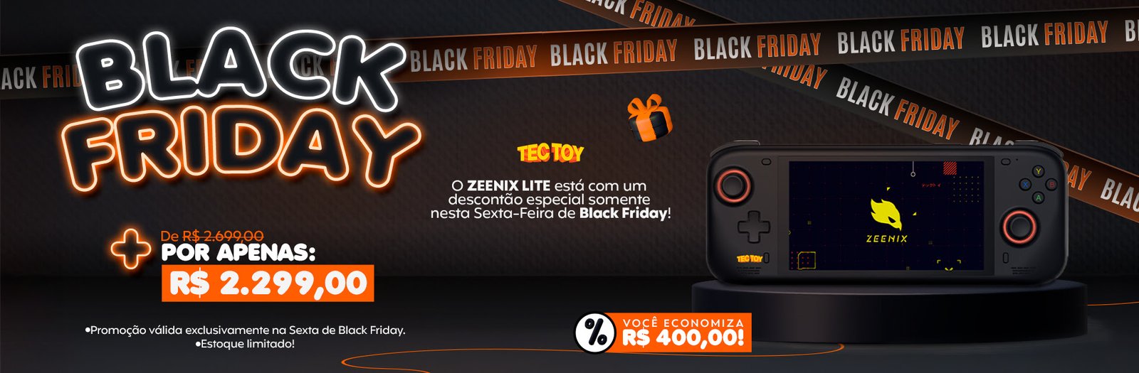 A Tec Toy preparou uma oferta exclusiva para a Black Friday, que acontece nesta sexta-feira (28). O Zeenix Lite, versão de entrada do PC portátil da marca, e o headset gamer X20 7.1 estarão com preços reduzidos por tempo limitado, ou enquanto durarem os estoques. O Zeenix Lite vai de R$ 2.699 para R$ 2.299, enquanto o headset passará de R$ 299 para R$ 239.