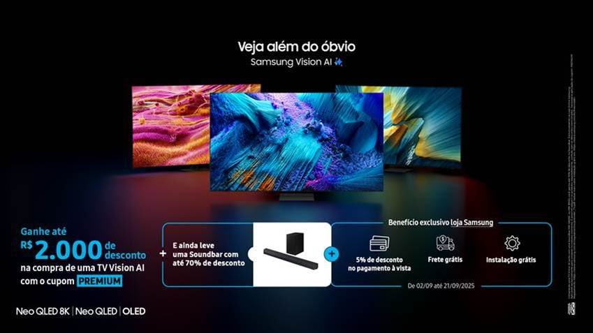 Até 21 de setembro, quem adquirir uma Neo QLED 8K, Neo QLED ou OLED da linha 2025, ganha até R$ 2 mil de desconto. Para isso, basta adicionar o cupom PREMIUM, exclusivo da loja Samsung, na hora da compra. Outros benefícios incluem frete e instalação gratuitas para os usuários.